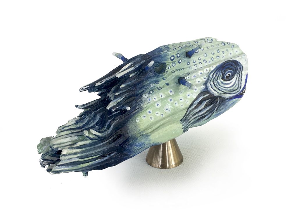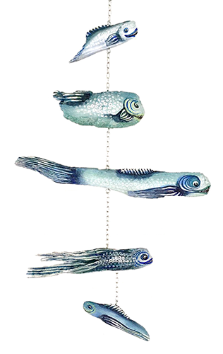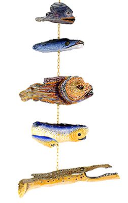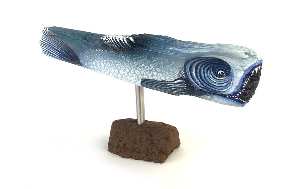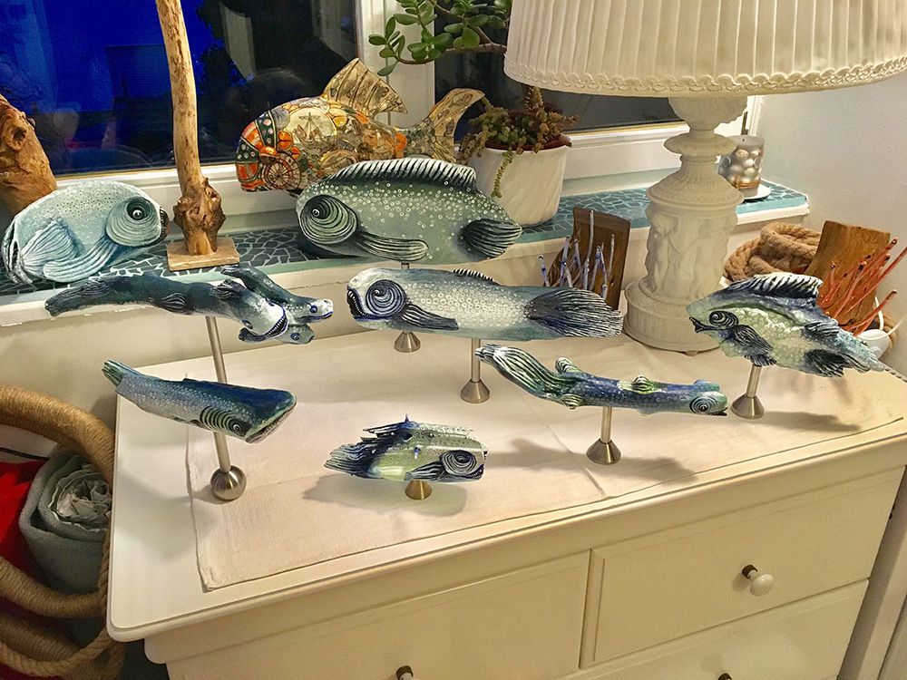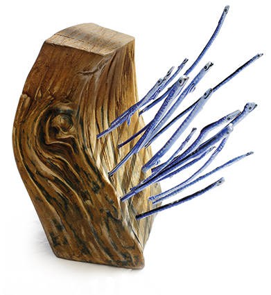 So entstehen unterschiedliche Fische, große, kleine, dicke und dünne. Mir ist dabei wichtig, die Stücke in ihrer Form zu belassen, um die Unterschiedlichkeit des Holzes durch die Naturkräfte darzustellen und vorwiegend natürliche Farben zu verwenden.